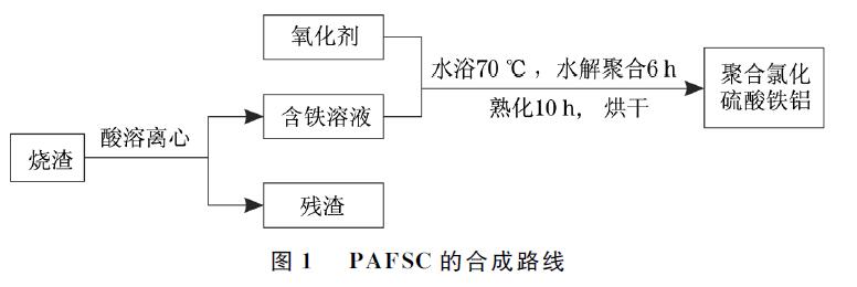 將一定量硫鐵礦燒渣置于三口燒瓶中,三端分別接溫度計、攪拌裝置和冷凝管.硫鐵礦燒渣經高溫焙燒后,表面有一層致密的氧化膜,采用鹽酸和硫酸混酸酸溶。加入質量分數(shù)為20%的HCl和H2SO4,硫鐵礦燒渣與混酸酸溶的固液比為1∶2.5,水浴加熱90℃,攪拌速度為180r/min,反應3h,燒渣中鐵的浸出率達85.3%.完全反應后將反應物轉入離心管中以10?。埃埃埃颍恚椋铍x心3min.分離得到聚合反應準備液,聚合反應準備液進行水解聚合合成PAFSC.使水解聚合反應得以順利進行的關鍵之處在于控制適宜的pH和鐵濃度.適宜的pH(質量分數(shù)為1%的水溶液pH為2~3)可以使鋁鐵不斷進行水解反應而不生成沉淀,鐵濃度的限定(Fe質量分數(shù)大于等于12%)是為了得到合格的絮凝劑產品和較好的絮凝性能.本實驗硫鐵礦燒渣經混酸酸溶,不需調節(jié)pH,同時保證了較高的鐵利用率.酸溶所得酸浸液Fe質量分數(shù)為14.56%,質量分數(shù)為1%的水溶液pH為2.16(GB14591—2006,聚合硫酸鐵,Fe質量分數(shù)大于等于11%,質量分數(shù)為1%的水溶液pH為2~3).液體加入三口燒瓶中,加入一定量的Al2O3(控制Al與Fe物質的量比為1∶8),溫度為70℃,轉速為180r/min,加入一定量氯酸鈉作氧化劑(根據(jù)測定的Fe2+物質的量的110%投加),水解聚合6h.反應完全后,冷卻至室溫,熟化10h,得紅棕色液體.產品鹽基度檢測為11.3,Fe2+含量測定質量分數(shù)為0.02%(GB14591—2006,聚合硫酸鐵,鹽基度8~16,Fe2+質量分數(shù)小于等于0.1%),置于烘箱以105℃烘干,研磨成粉,備用.PAFSC的合成技術路線如圖1所示.