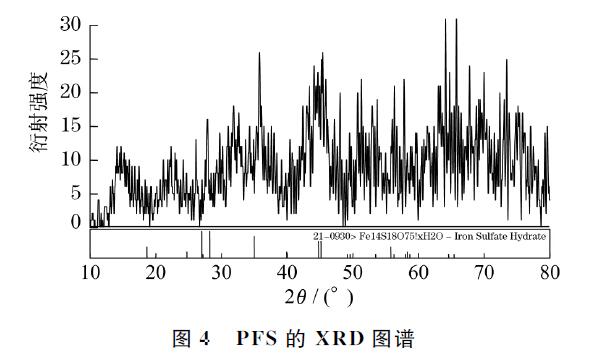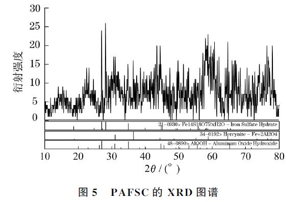 用XRD測定PFS和PAFSC的晶體結構,分別如圖4和圖5所示.由圖4和圖5可知,存在晶體峰疊加在較多非晶態(tài)的漫射峰上,這表明PAFSC與PFS均輕微的結晶化.同時,PAFSC的峰與標準峰相比均有一定的偏移,這是由于晶格的收縮或膨脹引起的.XRD圖譜表明PFS和PAFSC中均含有硫酸鐵鹽,同時,由于Al 3+的引入,合成的PAFSC并未顯著改變結構,但生成了像鐵鋁尖晶石和羥基氧化鋁(圖5)等新的物相.