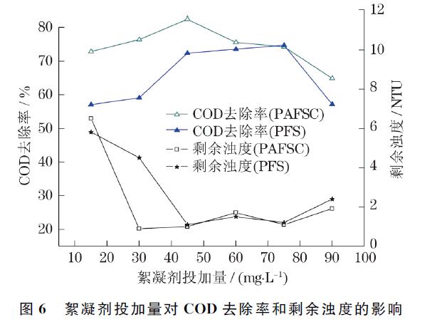 c.PAFSC在投加量為45mg/L時,COD和濁度去除率分別能達到82.4%和99%.相比PFS,合成的PAFSC具有更加高效穩(wěn)定的絮凝性能.復合絮凝劑的性能相較傳統(tǒng)絮凝劑更好,利用硫鐵礦燒渣的研究可致力于引入較高價態(tài)的陰離子來合成新型復合絮凝劑。