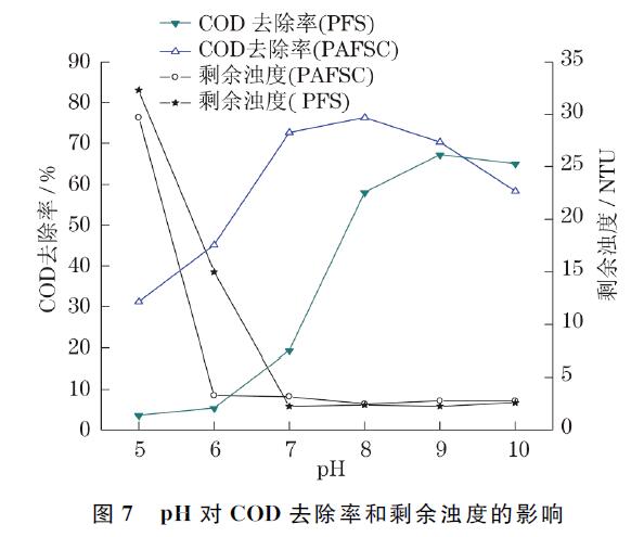 經SEM,XRD和FTIR等方法表征,探究了PAFSC的結構和形態(tài),PAFSC主要是羥基與鋁鐵橋連的聚合鐵鋁混合物.進一步探究PAFSC的絮凝性能,采用PAFSC和PFS處理生活廢水,在不同投加劑量以及不同pH條件下,測定其COD及濁度的去除率,對PAFSC的絮凝性能進行評價.不同的PAFSC投加量對COD以及濁度的去除率如圖6所示.其中,隨著PAFSC和PFS投加量不斷變大,剩余濁度先由大變小再變大.PAFSC的投加量由15mg/L至45mg/L,COD的去除率和剩余濁度分別不斷增大和減?。都恿窟_到45mg/L時,繼續(xù)投加絮凝劑,絮凝性能有所下降,這有可能是由絮凝劑電中和作用和吸附架橋兩種機制引起的.由于水體中帶有大量負電荷,膠體顆粒由于電荷的同性相斥而趨向形成一個分散穩(wěn)定的體系,加入帶有大量陽離子的PAFSC絮凝劑后,膠體表面的負電荷逐漸被中和而導致膠體顆粒脫穩(wěn),從而不斷凝聚絮凝和沉淀.但隨著加入的絮凝劑過量后,由于絮凝劑本身的特性,形成的絮體表面重新帶電而出現(xiàn)了再穩(wěn)定現(xiàn)象.而絮凝過程中的吸附架橋作用,投加量較低時,絮凝劑難以形成足夠多的架橋連接各個膠體顆粒.但投加過量時,缺少足夠多未被吸附的顆粒不斷連接在長鏈狀的橋上,同時顆粒變得更不穩(wěn)定.綜上所述,較佳絮凝反應存在一個較適宜的絮凝劑投加量.絮凝實驗結果表明,PAFSC相比PFS有著更優(yōu)異的絮凝性能,在投加量為45mg/L時,COD去除率為82.4%,剩余濁度為1NTU(濁度去除率達99%).這可能是PAFSC相比于PFS,由于鋁的添加使得鐵鹽和鋁鹽不斷水解互相交聯(lián)、共聚,從而形成具有多核、更長、更穩(wěn)定的高分子聚合長鏈提升吸附架橋能力;同時,由于氯離子的引入,使鋁鐵共聚物的分子量和穩(wěn)定性得到一定的提升,也使多核共聚物的電荷量有所提高而促進了電中和作用.在使用絮凝劑處理廢水的絮凝過程中,污水的pH對絮凝效果影響較大.測定pH在5~10的范圍內,投加相同劑量的PAFSC和PFS,測定其COD的去除率及剩余濁度,結果如圖7所示.由圖7可知,pH在5~8時,PAFSC和PFS處理廢水時COD去除率不斷增大.這主要是因為在較低的pH條件下,溶液中陽離子過多抑制絮凝劑的水解.但隨著pH的增大,溶液中的羥基與絮凝劑會進一步反應,使得絮凝劑中未反應或未完全反應的鋁鐵進一步聚合,從而增強其吸附架橋的能力.同時,膠體的表面電荷因電中和作用電荷量不斷降低,促使懸浮物脫穩(wěn)不斷絮凝.然而,在更高的堿性環(huán)境中,絮凝劑會受到水中過多的OH-與本身所帶正電荷的電中和作用的影響,導致所帶電荷量減小,抑制絮凝過程中的電中和作用[22].此外,PAFSC在較寬的pH范圍內處理效果均高于PFS,且在pH較小時,COD去除明顯優(yōu)于PFS.PAFSC相對于PFS,當pH在7~9時,能達到較佳的處理效果,應用范圍更廣,絮凝性能也更加穩(wěn)定,PAFSC和PFS對濁度的去除隨著pH的增大先急劇減小后逐漸穩(wěn)定.但PAFSC與PFS對比,PAFSC在pH較低的廢水中有較好的濁度去除效果.