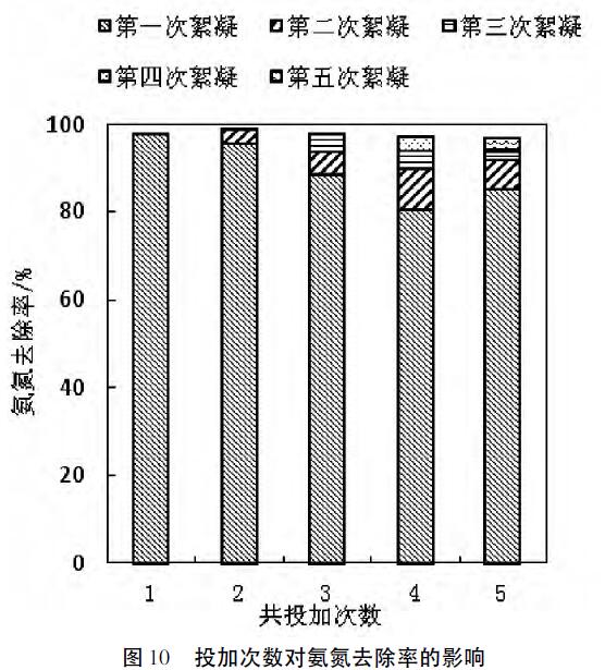 按照nFe2+/nH2O2為1:6的比例,Fenton試劑按理論投加量的三倍進行投加,反應1.5h,COD的去除率達到了79.9%,經處理之后的COD的含量仍高達1460mg·L-1,遠遠高于國家排放標準。根據化學反應中少量多次的原則,可以將Fenton試劑總的投加量平均分為1、2、3、4、5份,然后分成多次進行投加,對水體進行氧化反應,考察不同投加次數對處理效果的影響,結果如圖9、10所示。將Fenton試劑平均分成4份,分次進行投加時,經過四次氧化處理過程后,COD的去除率達到了97.6%,COD含量降至了175mg·L-1,已經符合了國家排放標準,另外由圖10可以看出,無論Fenton試劑分幾次加入,氨氮的去除率均達到98%以上,并且氨氮含量均低于國家排放標準,因此綜合考慮Fenton試劑的較佳投加次數為4次。